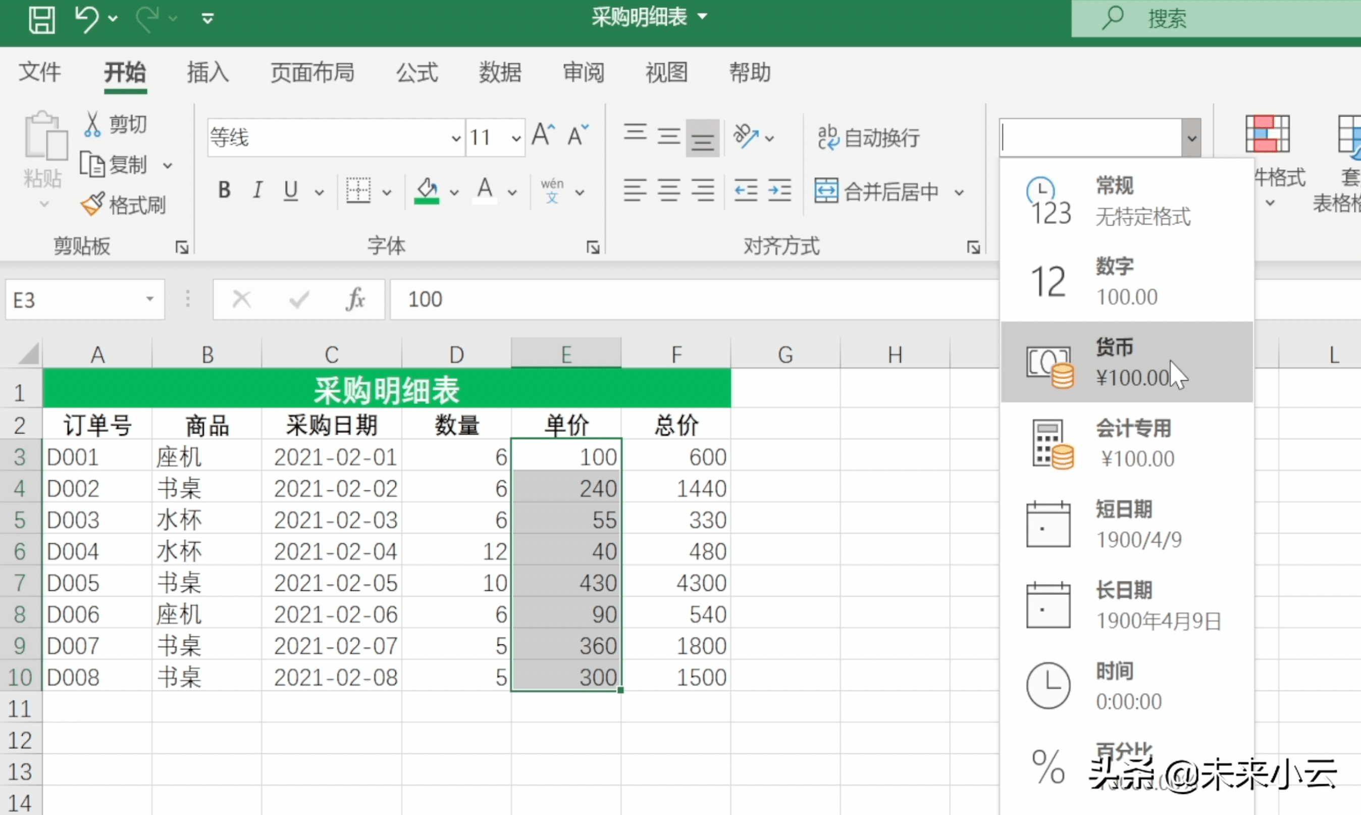 和日期格式一样,我们可以在「数字」选项卡,将单价的数据类型设置为「货币」,同时点击三个000的右箭头两次,去掉连两个小数位数。这样,货币格式我们就设置完成啦!