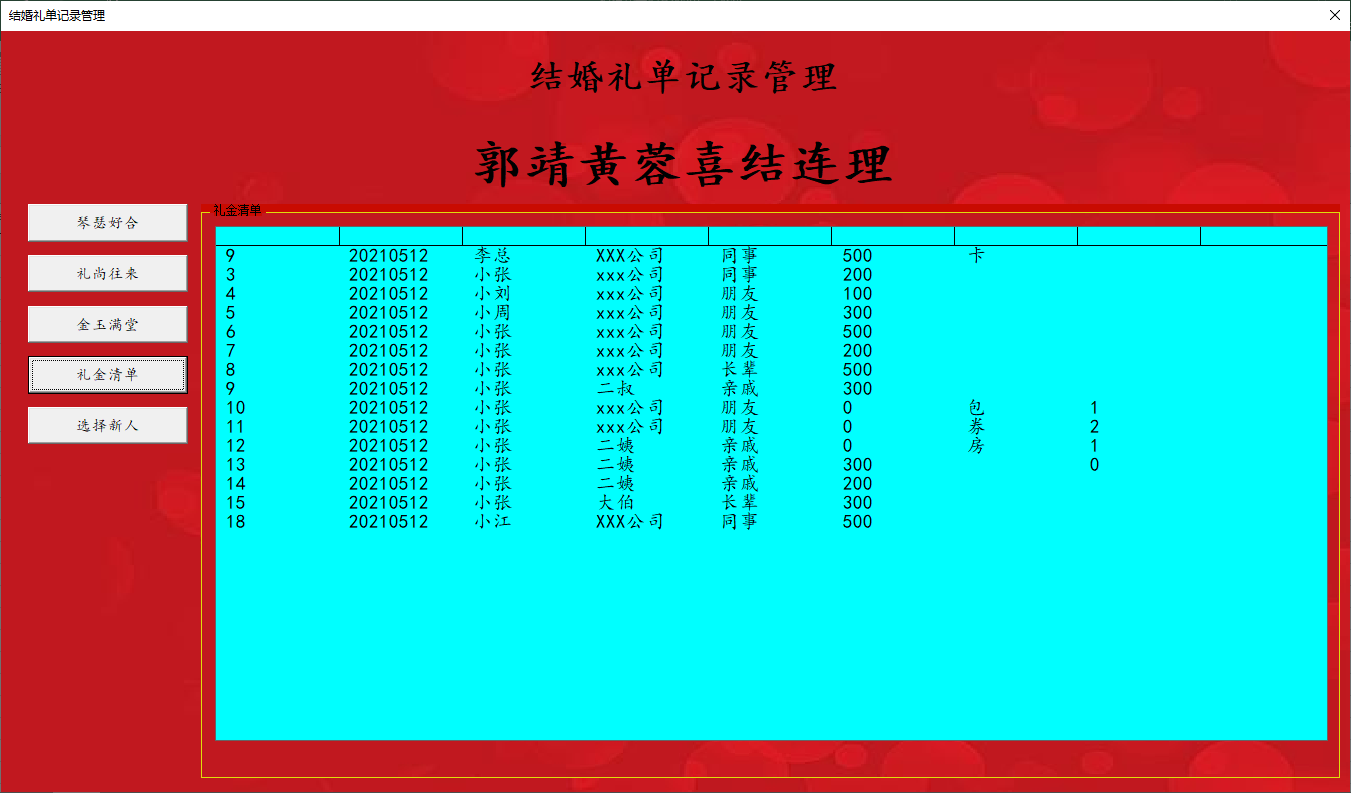 下图为当前结婚礼单信息总表,这个没什么可解释的,就是所有礼金(礼物)记录。