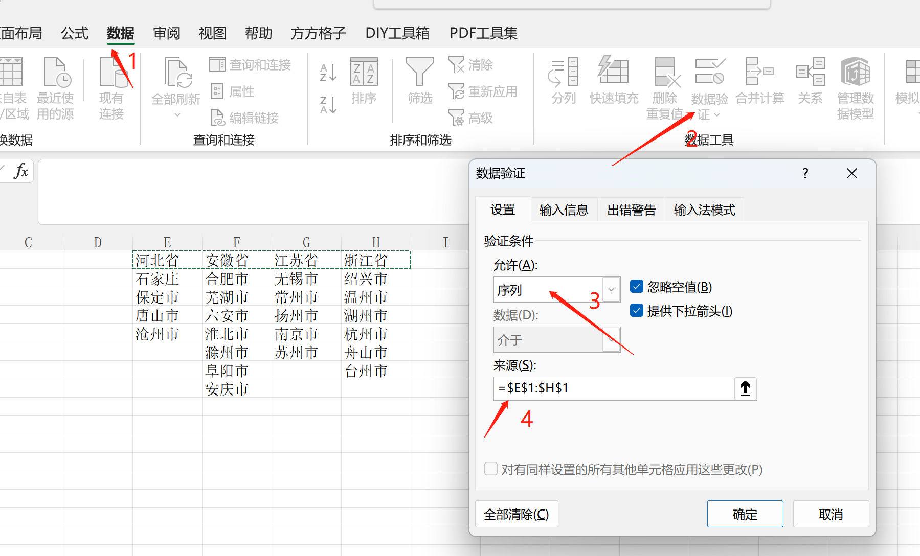 2、点击确定按钮,这样关于省份的一级下拉菜单我们就制作完成了