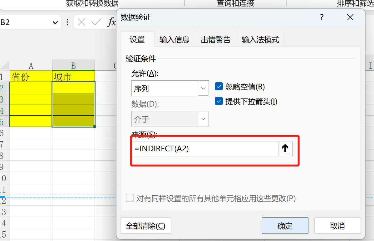 (3)再次选择B2:B5区域,点击数据菜单中的有效性选项,选择序列,来源内输入=INDIRECT(A2),点击确定。如下图
