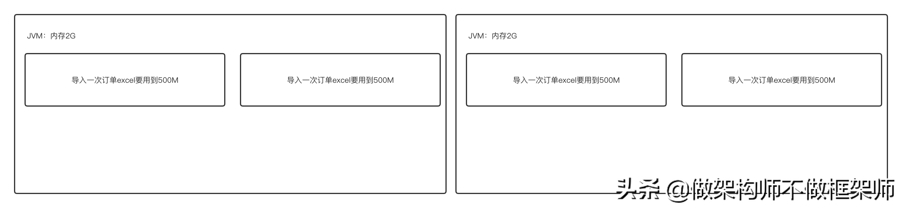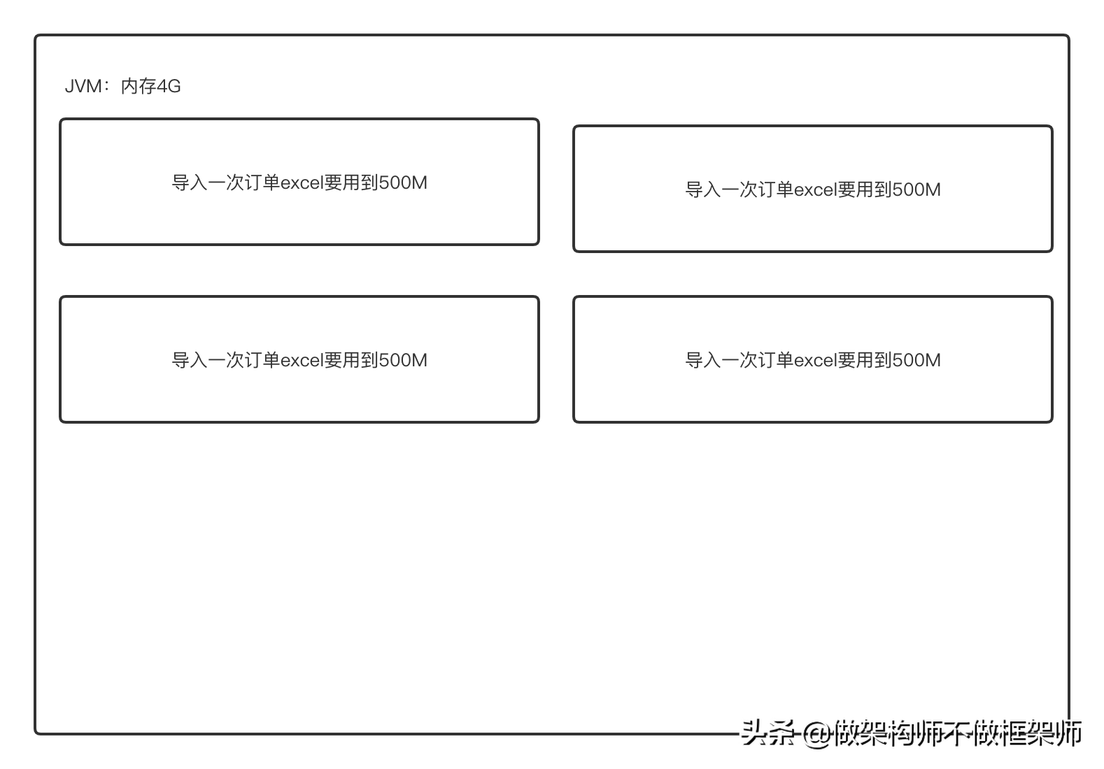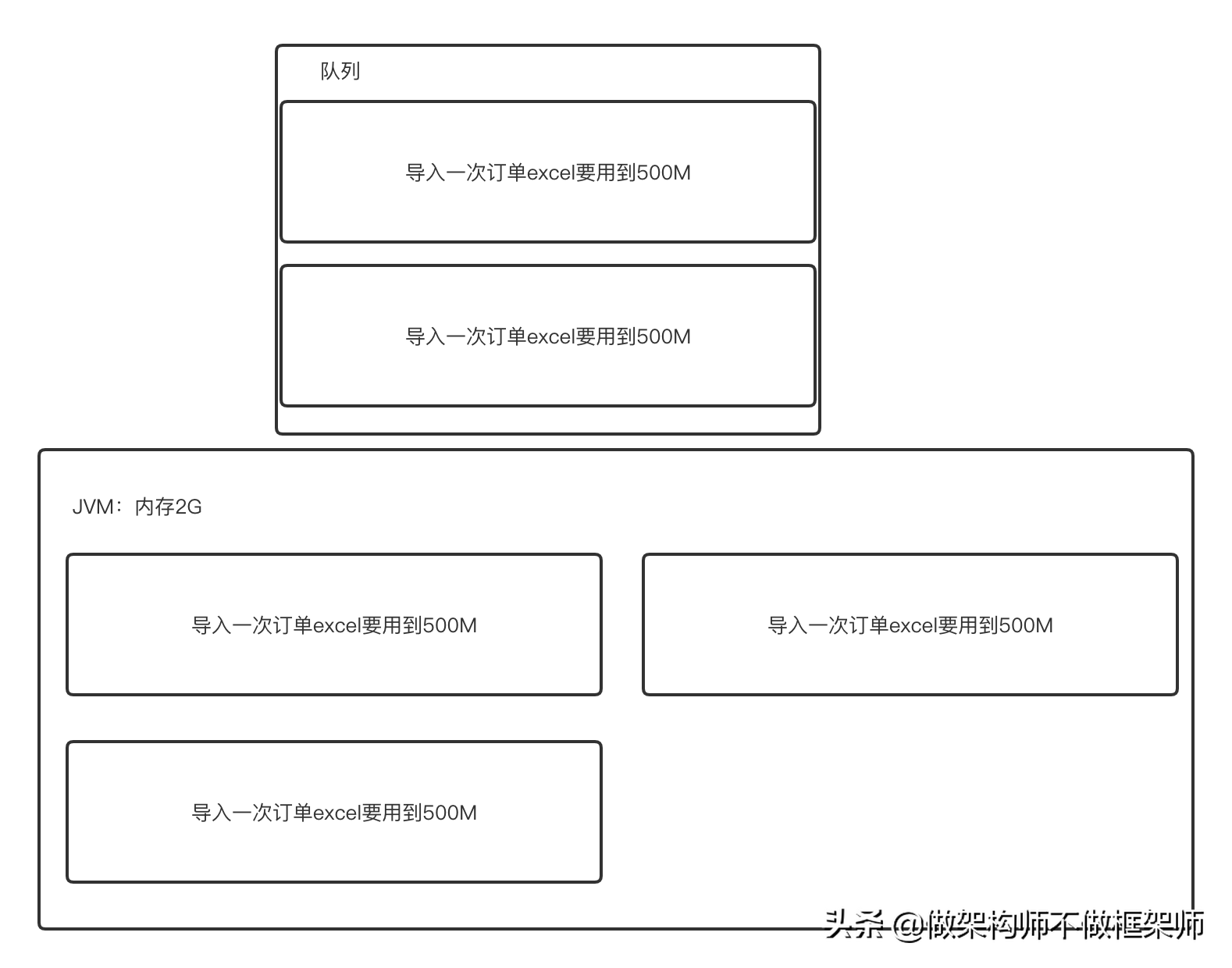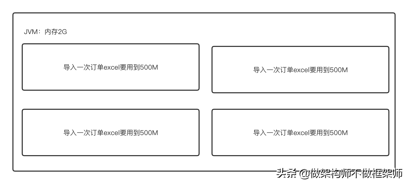 一天,另一个项目的老大枫哥急匆匆地来找我说:“小米,运营那边说系统导入订单的时候无法导入,我看了下是JVM内存满了,后来跟他们仔细聊了下,发现是同时几个人一起导入的,内存我配置了2G,几个大excel导入内存就满了,欢哥让我先出个临时方案解决下,后期再对整个功能优化下,我没什么思路,你有没有啥想法?”。