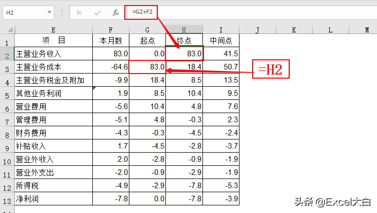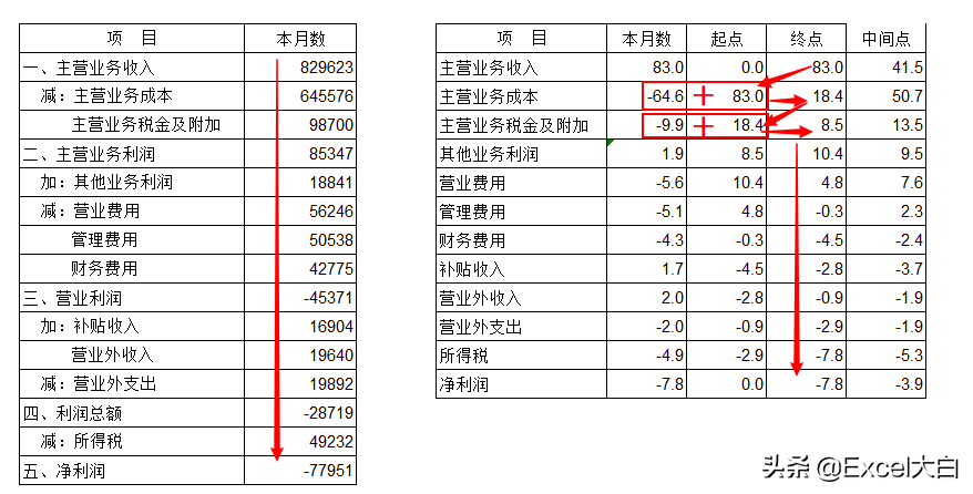 我们从利润表里可以看出,最后的“净利润”是由最开始的“主营业务收入”与中间的所有项目依次相加或相减得到的,为了在图表中准确的表达出这种关系,我们需要在辅助表中表达出这种关系。