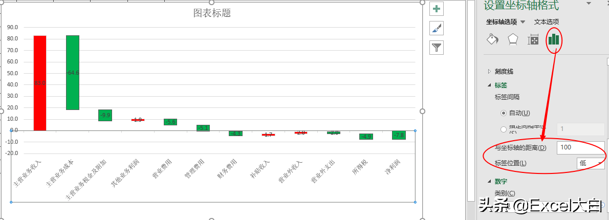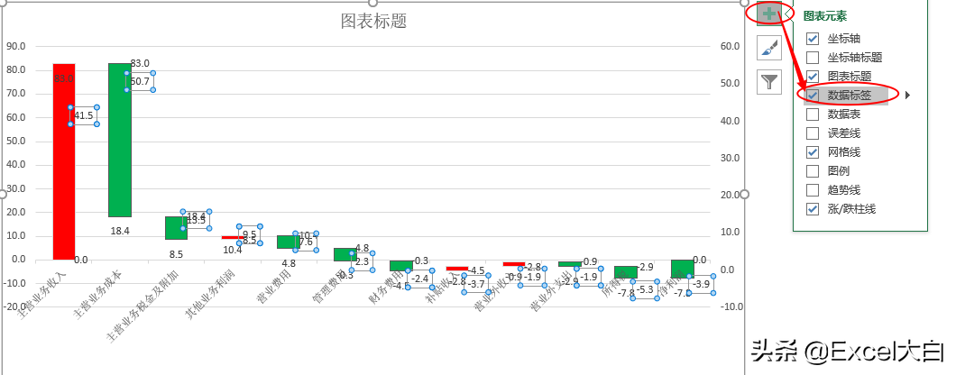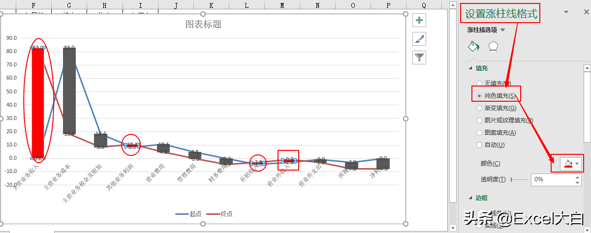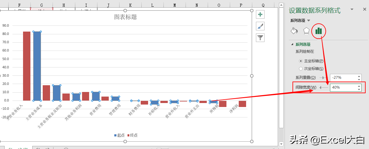 其他项目的起点设为上一项数据的重点,如图所示,即:“主营业务成本”的“起点”=“主营业务收入”的重点。