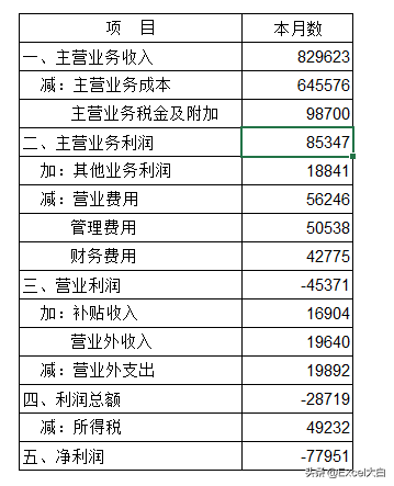 下图是一份利润表,对于专业的财务人员来说,看懂这份表当然没有问题,但对于不懂财务的人来说就只知道这个月收入多少、净利润多少,至于中间这些钱到底去了哪里,我相信绝大部分的人都不知道。