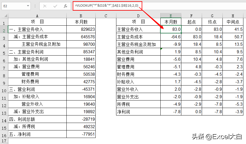 如下图:我们去掉了“二、主营业务利润”、“三、营业利润”、“四、利润总额”。然后在辅助数据表的E2单元格输入公式:=VLOOKUP("*"&D2&"*",$A$1:$B$16,2,0),从原始利润表中引入数据,然后向下填充。