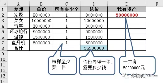 把自己的总资产、梦想、单价、每个梦想按照一件算的价格、总资产等输入表格,如下图: