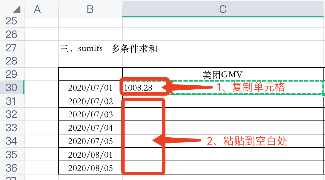 因为每一个结果进行判定的条件都是一致的,都是判定【日期】和【平台】这两个条件,所以只需要将刚刚完成结果的单元格进行【复制】,【粘贴】到需要计算结果的空白单元格中,即可自动计算出结果。完成。