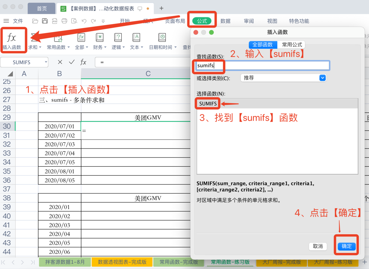 SUMIFS(用来求和的数值区域,条件1判断的所在区域1,条件1,[条件2判断的所在区域2,条件2],......)
