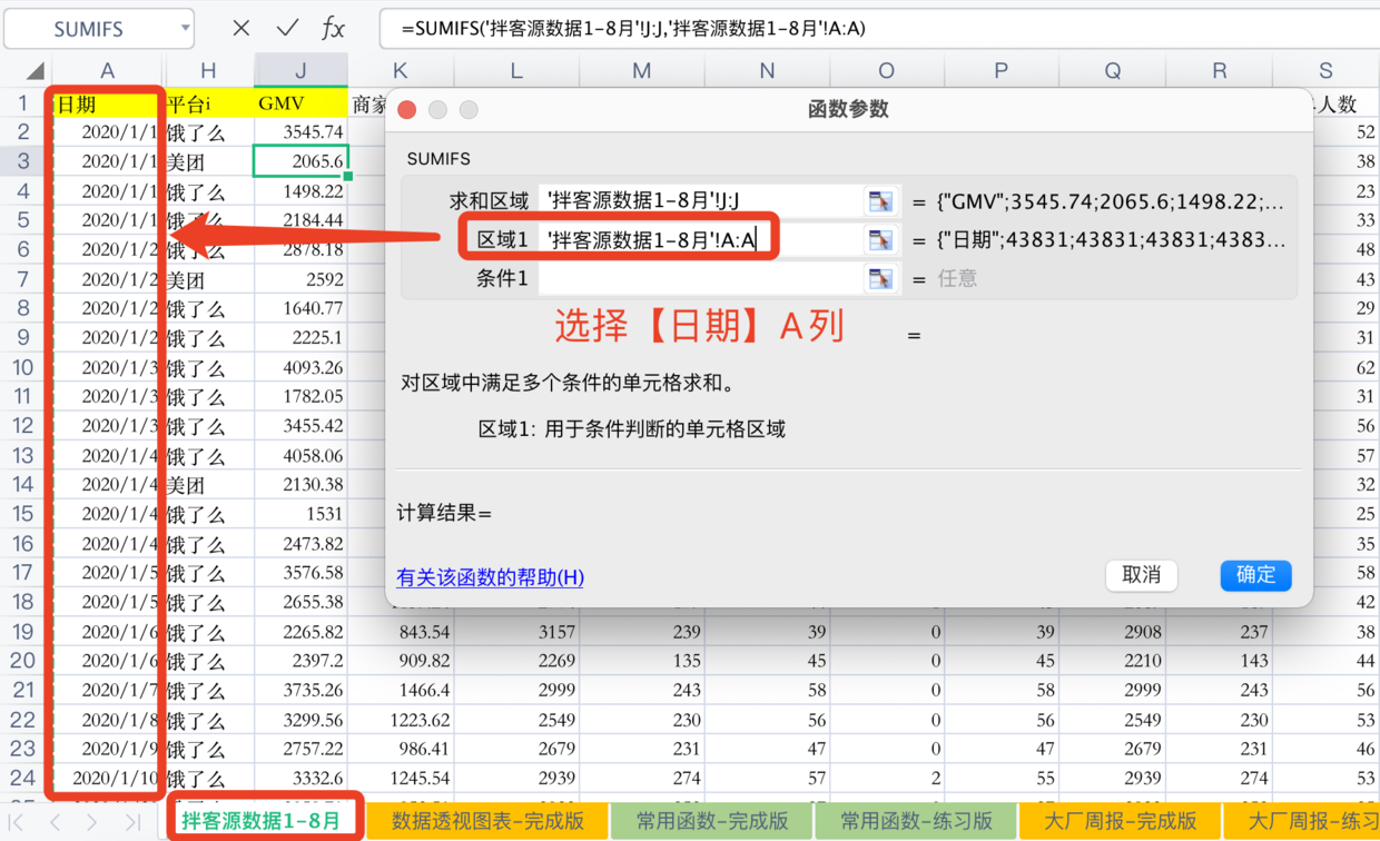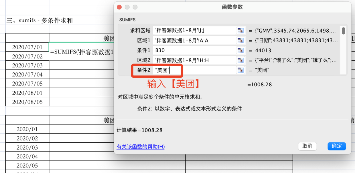 因为是只计算“美团”平台的GMV,所以“区域2”选择“拌客源数据1-8月”的【平台i】的H列,在“条件2”输入【"美团"】。(注意要用英文字符的双引号""框住中文字)。