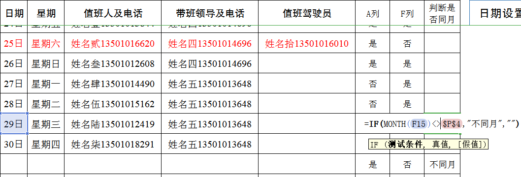 =IF(MONTH(F15)<>$P$4,"不同月",""),用MONTH(F15)计算当月的月份数,然后用IF函数判断是否和当前月一致,如果不一样则显示“不同月”,否则留空,然后往下拖动复制到31日的位置。