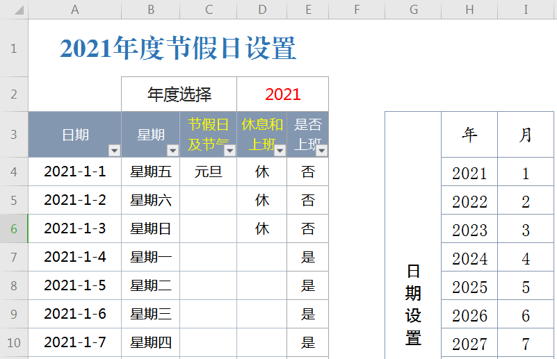 到此,“节假日和参数设置”表的设置就完成了。部分细心的朋友会发现该表中还有一个“日期设置”,主要是方便“排班表”调用选择。