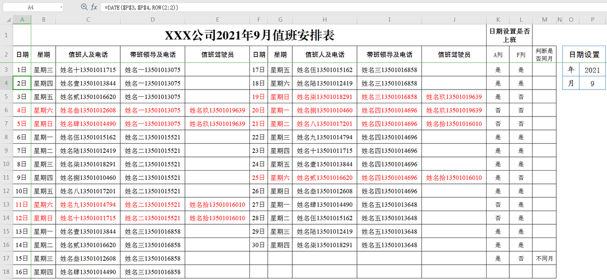 至此,我们的操作基本完成,下面设置一下条件格式显示休息日为红色就大功告成。