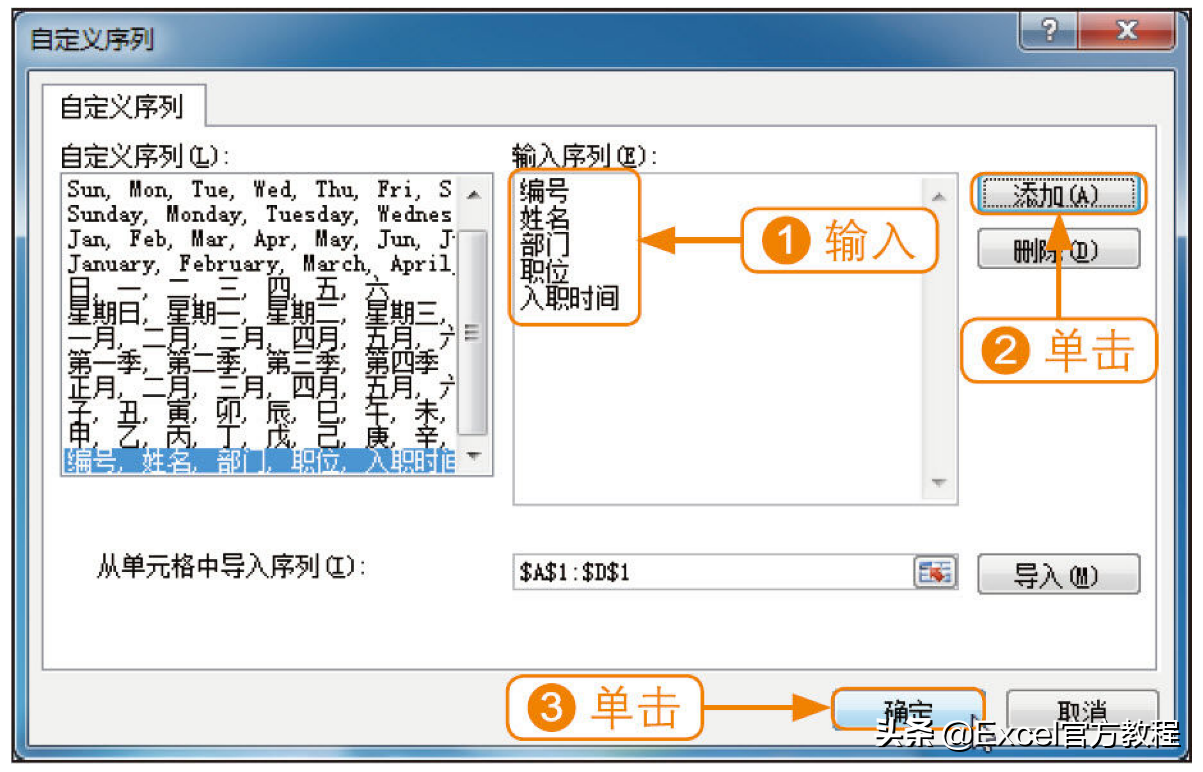 如果当前工作表上没有要添加自定义填充序列的项目,也可以在“自定义序列”对话框中通过输入的方式来添加,操作方法如下。