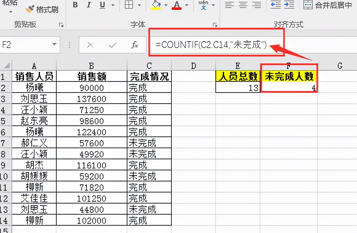 用法:=COUNTIF(单元格区域,统计条件),实例操作如下图:在F2单元格中输入公式:=COUNTIF(C2:C14,"未完成")