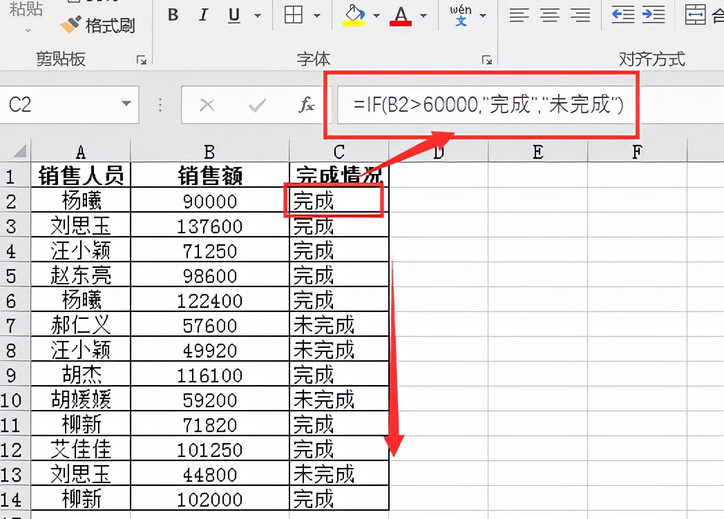这是这个函数的最基本的用法,也是最常用的方法:实例操作如下图:在C2单元格中输入公式:==IF(B2>60000,"完成","未完成")。