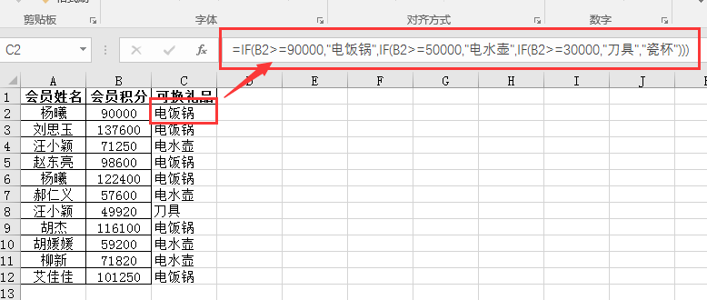 在C2单元格中输入公式:=IF(B2>=90000,"电饭锅",IF(B2>=50000,"电水壶",IF(B2>=30000,"刀具","瓷杯")))