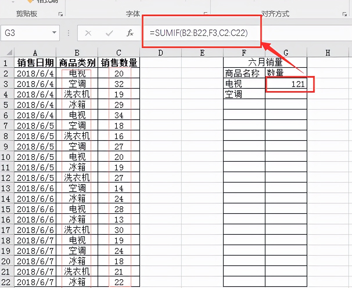 =SUMIF(B2:B22,F3,C2:C22),公式输完后直接按回车键。