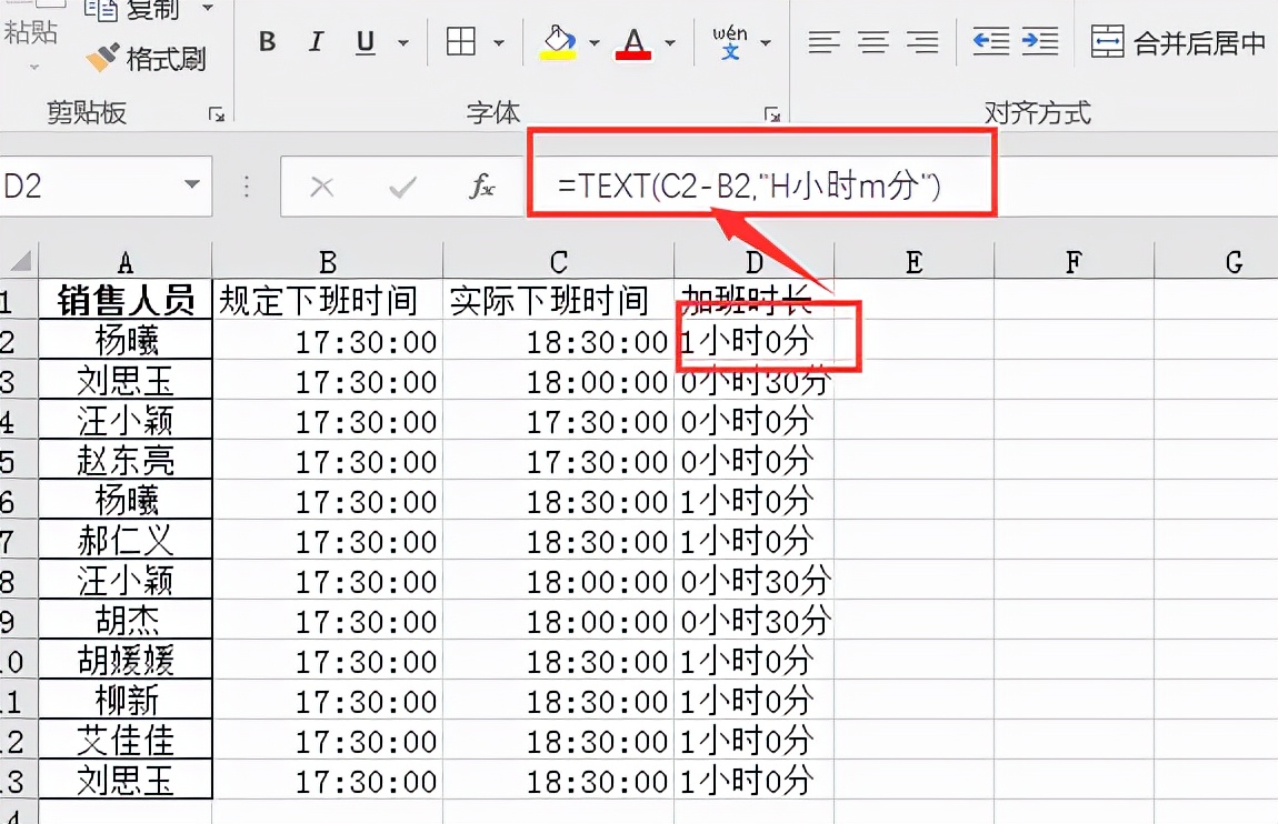 计算两个时间的间隔小时数,计算加班时经常会用到,实例操作如下图:在D2