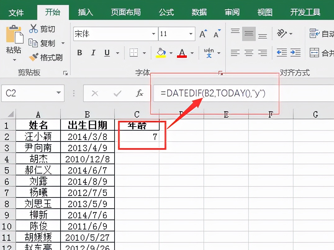 应用实例,如下图所示,要根据C列的出生年月计算年龄。在C2单元格中输入公式: