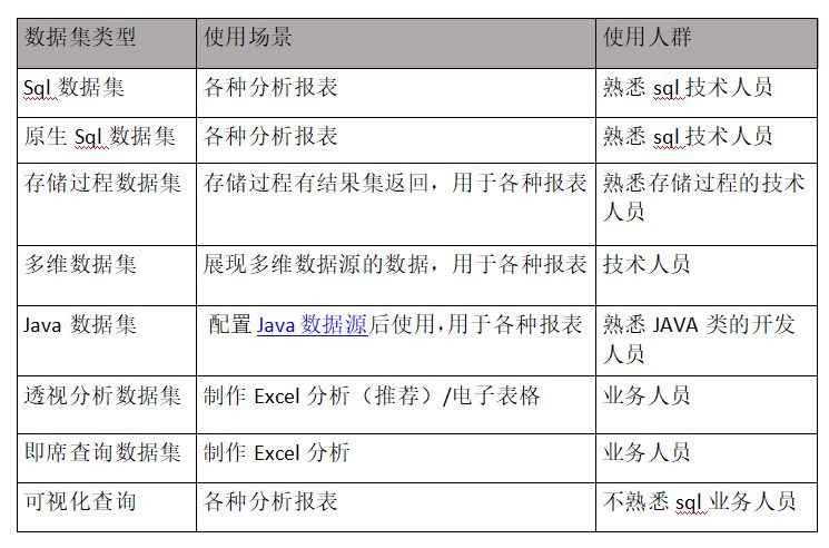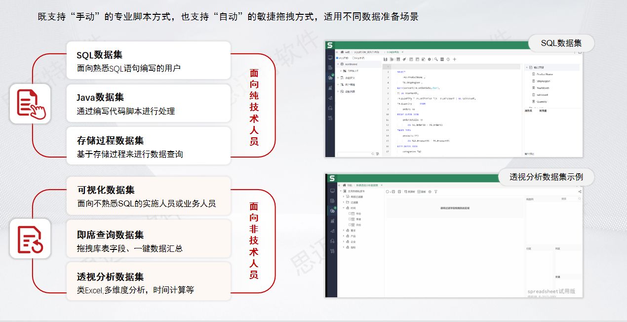 Spreadsheet为用户提供了强大而灵活的数据获取能力,一方面继承了需要掌握sql和存储过程等倾向于技术人员的传统数据集,如有:SQL数据集、原生SQL数据集、Java数据集、存储过程数据集、多维数据集。另外也具备可视化界面让业务人员也能实现数据准备,如:自助数据集、透视分析数据集、即席查询数据集、可视化查询。