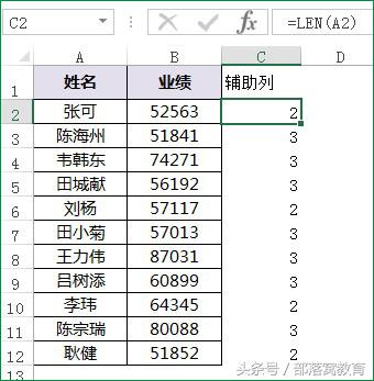 我们用C列做为辅助列,C2单元格输入公式:=LEN(A2),然后下拉复制公式,可以迅速统计姓名的字符数。