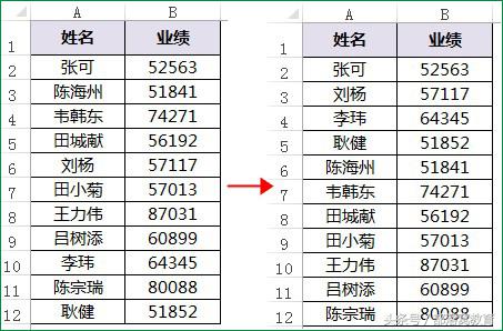 下面截图,左边是原数据,右边是根据姓名的字数来排序的结果。两个字的姓名排在前面,三个字的姓名排在后面。