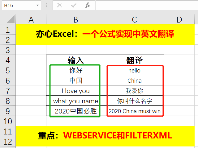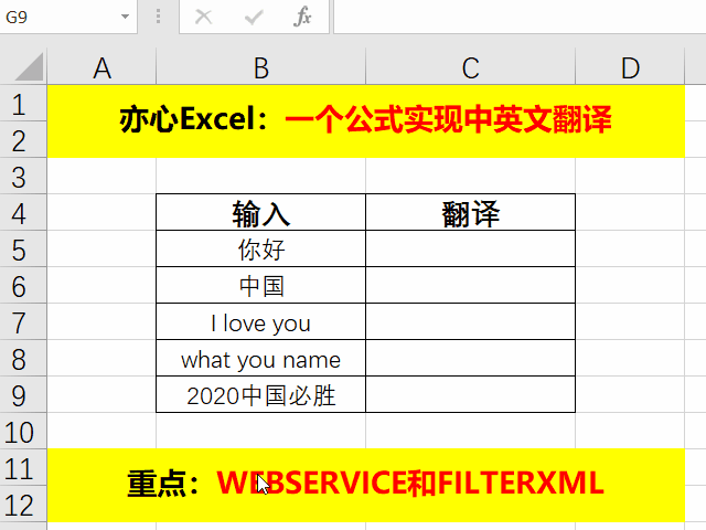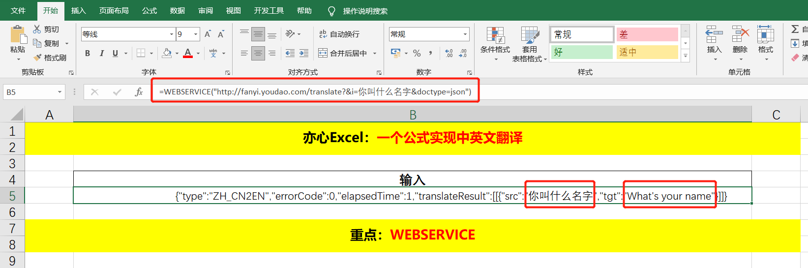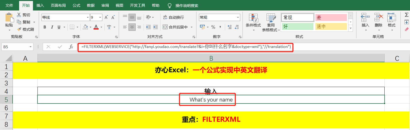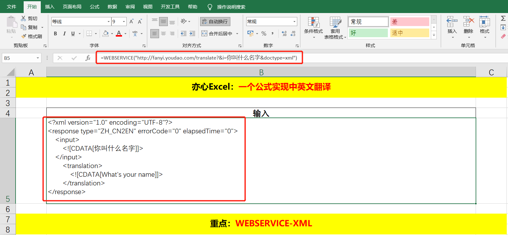 「=FILTERXML(WEBSERVICE("url?&i=你叫什么名字&doctype=xml"),"//translation")」。