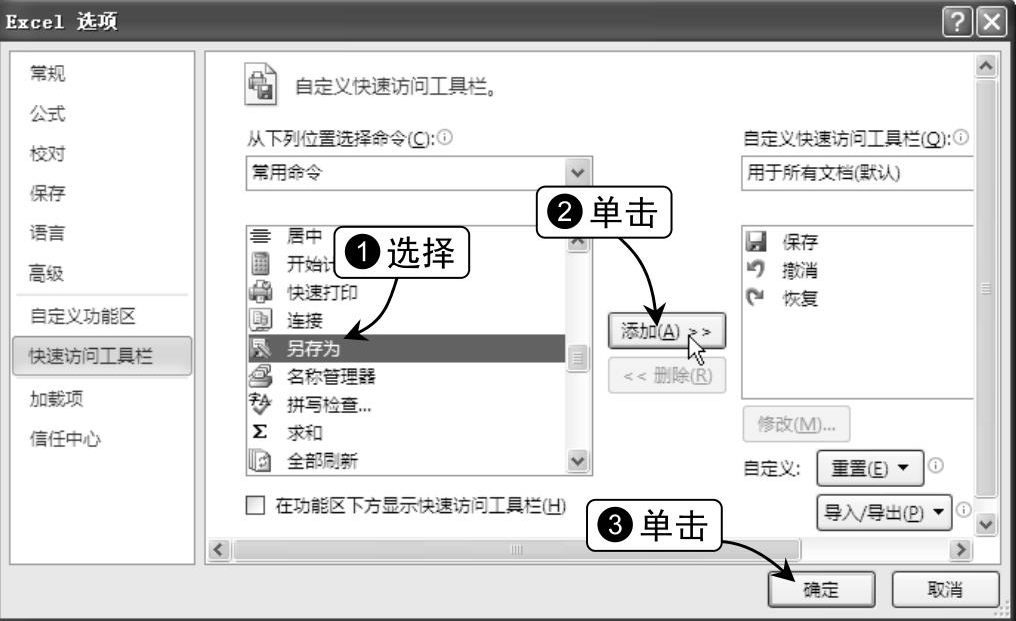 单击快速访问工具栏右侧的“自定义快速访问工具栏”按钮,在弹出的下拉菜单中可选择需要显示的常规命令选项,如图1所示;如果选择“其他命令”命令,可打开“Excel选项”对话框的“快速访问工具栏”选项卡,在其中选择命令添加到工具栏中,如图2所示