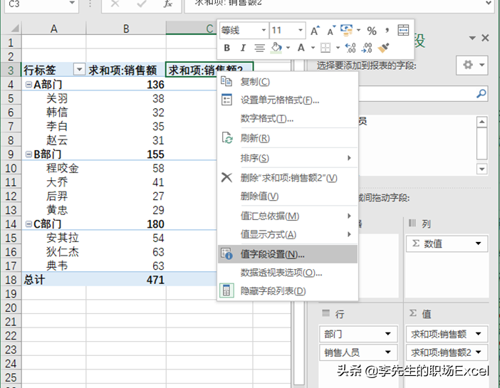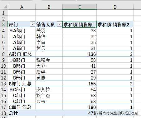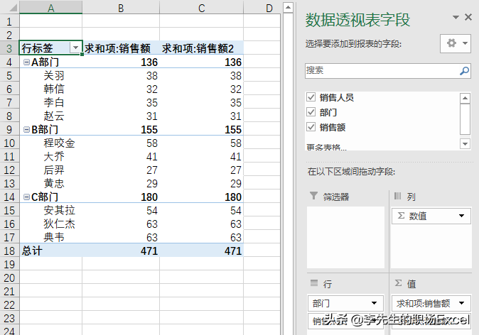 2、依次将部门、销售人员拖动到【行区域】中(注意一定要先拖动部门,再拖动销售人员),销售额拖动到【值区域】中,注意销售额需要拖动两次到【值区域】中