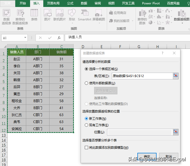 1、选中A1:C12数据区域,点击菜单栏【插入】-【数据透视表】