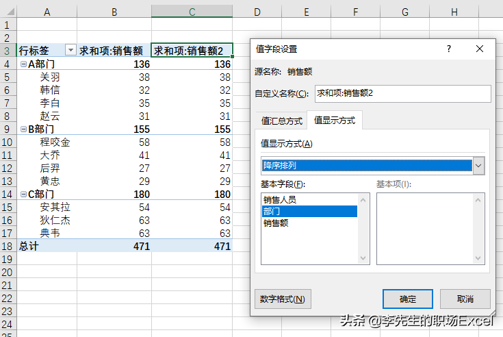 4、在【值字段设置】里面点击【值显示方式】-【降序排列】,【基本字段】选择【销售部门】,点击确定。