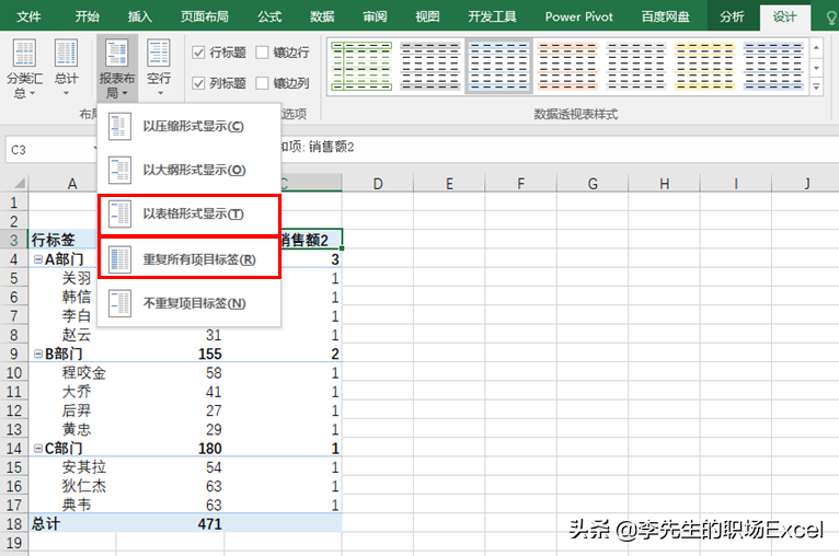5、点击菜单栏中的【设计】-【报表布局】,把透视表设置成【以表格形式显示】以及【重复所有项目标签】