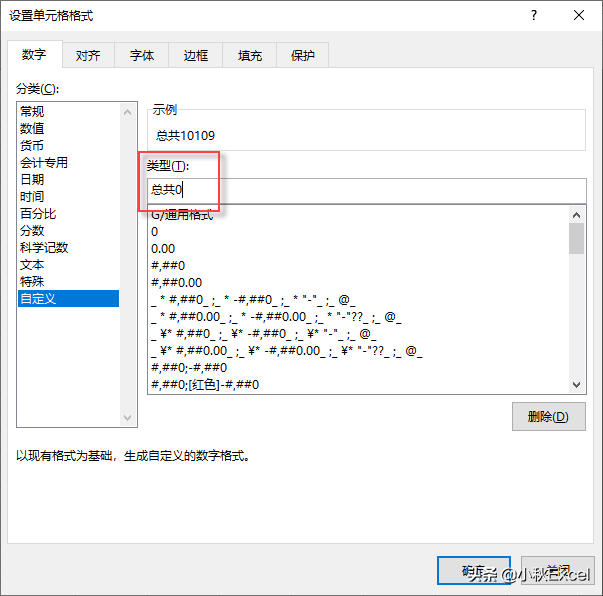 (5)如果要在数字前面添加文字也可以,在"设置单元格格式"对话框"类型"文本框中输入想要添加的文字+0即可,比如"总共0",如图5所示。