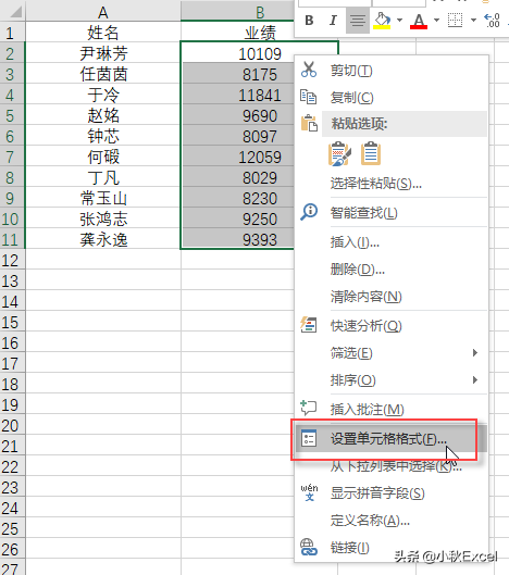 (2)如果想要将单元格中的数据附加上单位,首先选中单元格B2:B11,接着单击鼠标右键,在快捷菜单中选择"设置单元格格式"选项,或者直接按快捷键"Ctrl+1"快速打开"设置单元格格式"对话框,如图2所示。
