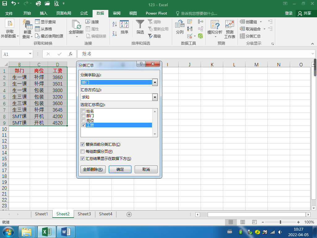 3.分类字段:选择你的分类字段,此例为部门。汇总方式:选择你的汇总方式。此例为求和。选定汇总项:选择你的汇总项,此例选择工资。其下三项简单,不作解释。全部删除:就是删除汇总表,恢复到原始数据表。