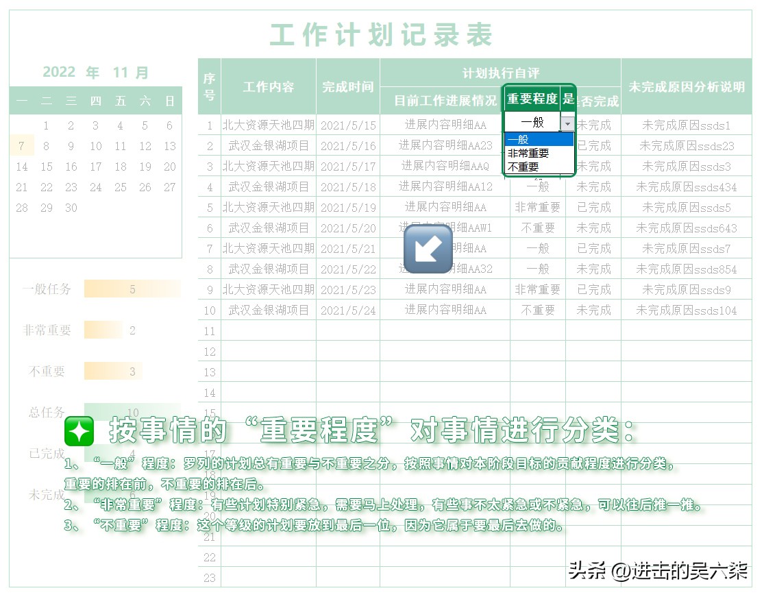 我在表格里面设置了三个重要程度选项:“非常重要”、“一般重要”、“不重要”,我们根据自己的工作规划来进行分类,这样可以明确提升自己的工作效率。