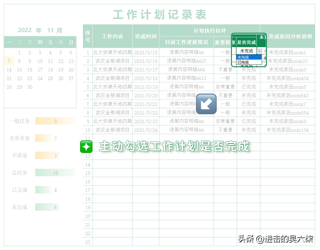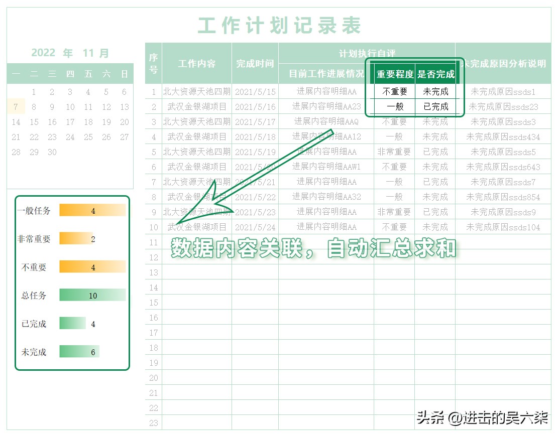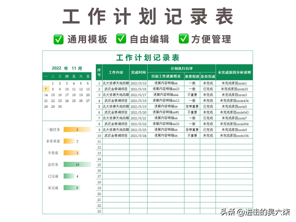 我今天就给大家分享一套简单实用的工作计划记录Excel表,可以自由编辑和汇总归纳,来实现工作计划内容的整理,可以直接下载套用:[比心]
