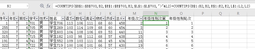 因为分班,为了均衡分班不能有重复次第,我们要消重。排次第加1的部分,不再是1。而是一个COUNTIFS函数,用来统计在下拉过程中,同年级同性别同分数出现的个数。跟前面函数一样,也有三个条件分别是:年级、性别、分数。三个条件的区域不再是固定不变,结束单元格而是随行号改变递增。所以绝对引用开始单元格的行,相对引用结束单元格的行:B$1:B2。在下拉的过程中,开始单元格不变,结束单元格增加。性别也一样。分数不再是求大于该分数的个数,而是等于该分数,所以直接引用L$1:L2,L2。