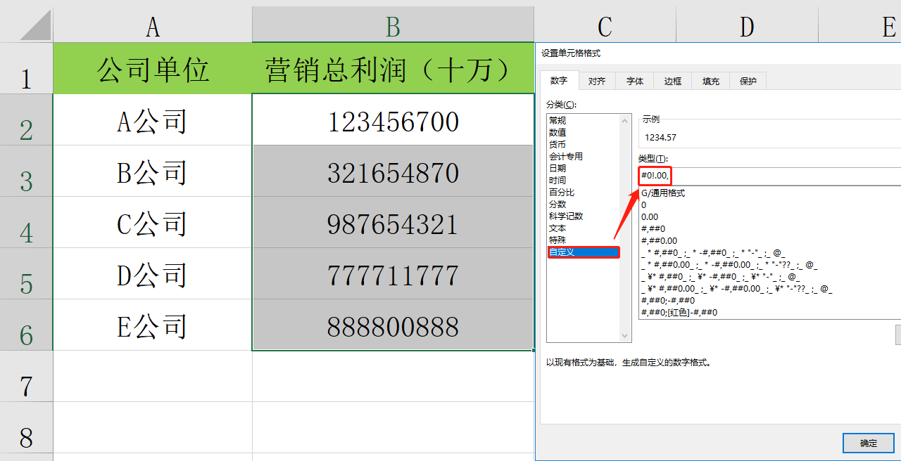 メ最后,我们还可以以十万为单位显示数据。选中数据后按住Ctrl+1设置自定义为【#0!.00,】点击确定。メ