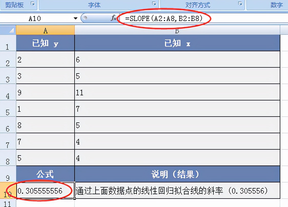 返回根据 known_y's 和 known_x's 中的数据点拟合的线性回归直线的斜率。斜率为直线上任意两点的重直距离与水平距离的比值,也就是回归直线的变化率。