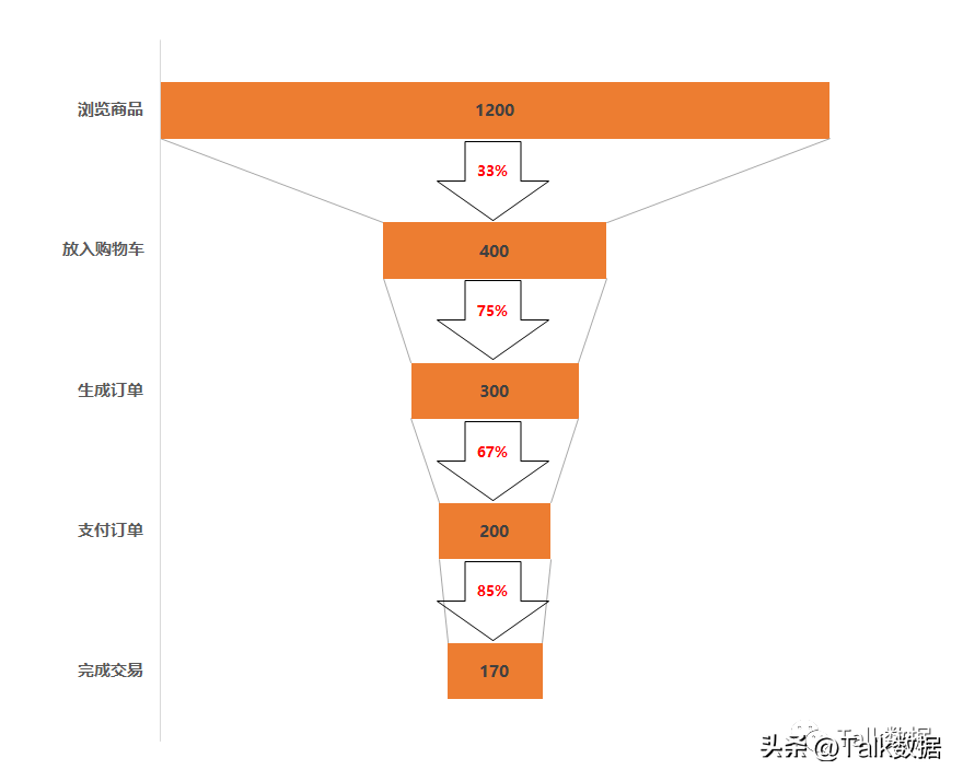 漏斗图分析法,就是用类似漏斗的框架对事物进行分析的一种方法,这种方法能对研究对象在“穿越“漏斗时的状态进行展示和分析,可以最直观的展示我们的业务流程。