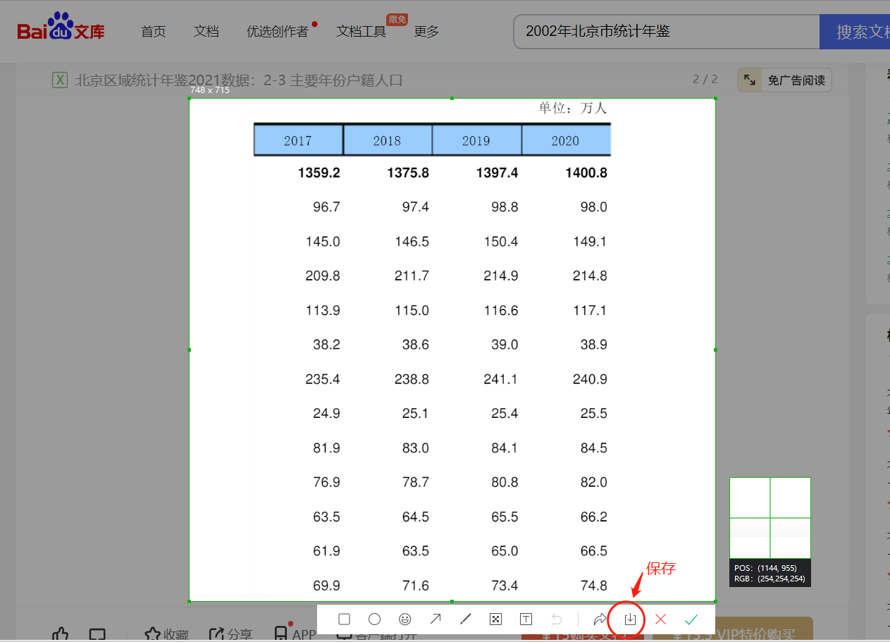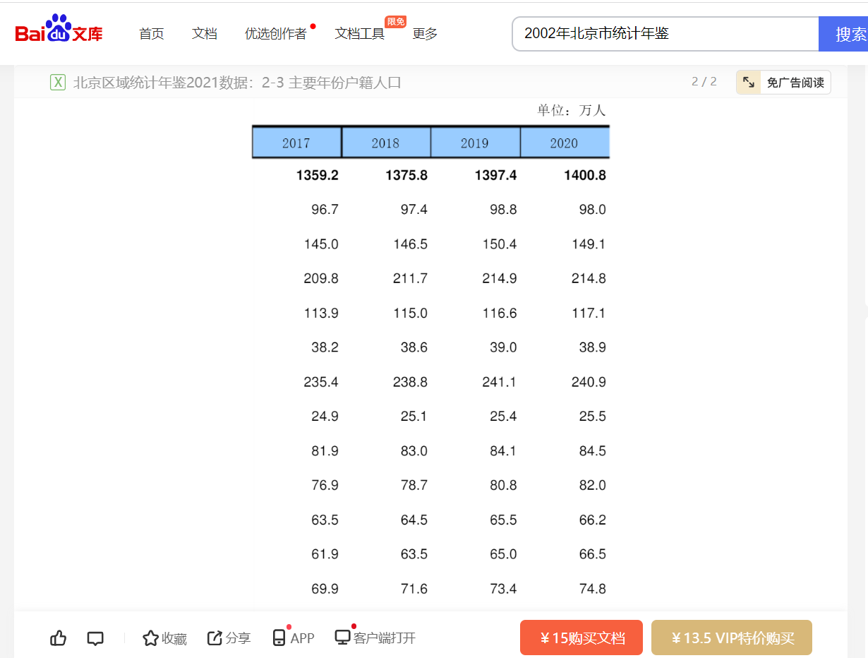 找到文库页面,找到自己想要的文档。如2002年北京市人口统计数据。