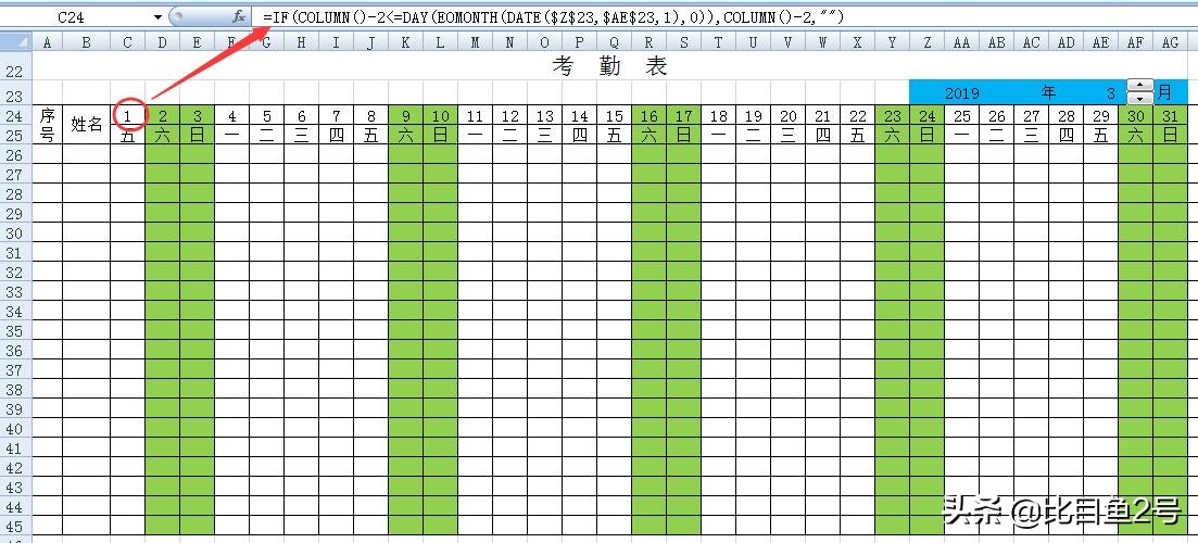 IF(COLUMN()-2<=DAY(EOMONTH(DATE($Z$23,$AE$23,1),0)),COLUMN()-2,""):通过与当前月的总天数进行判断,如果超过总天数则变为空,不超过则按顺序填写日期。