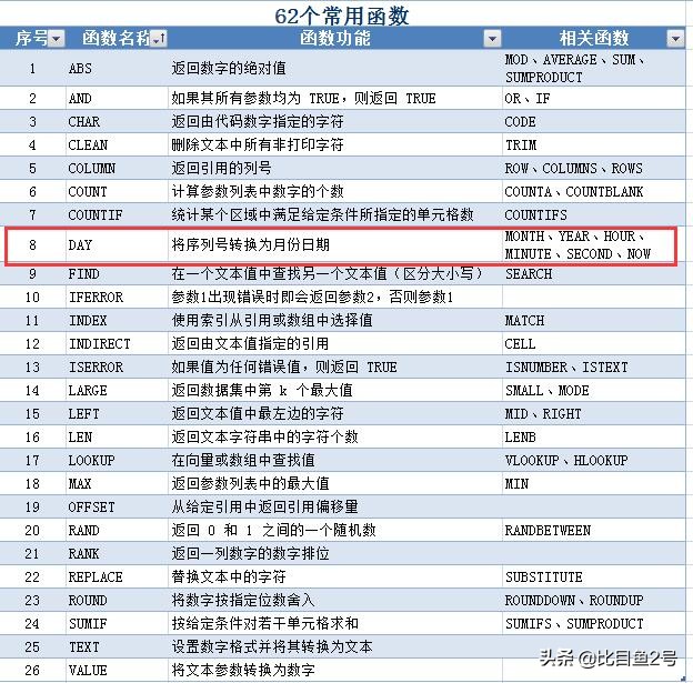 DAY():返回日期数据中的日数,比如=DAY(2019-3-8)结果就是8;