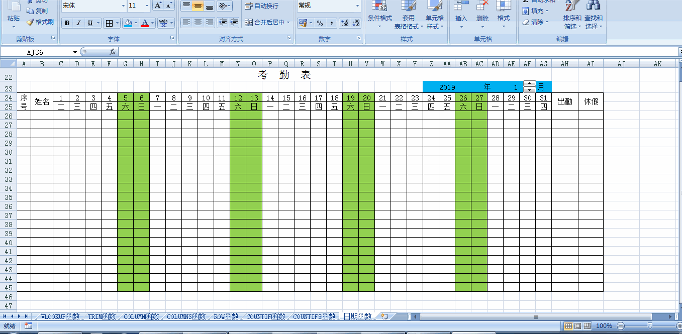 2、自制考勤表自动变化日期表头