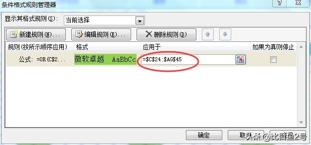设置好应用范围:=$C$24:$AG$45,最后一个数值代表涂色到多少行为止,可根据自己的要求进行调整。