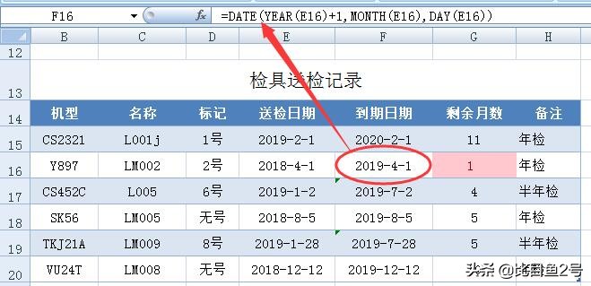 F16单元格公式:=DATE(YEAR(E16)+1,MONTH(E16),DAY(E16)),提取上次送检日期在年份上加1,其他月份和日数都不变,这是通过DATE、YEAR、MONTH、DAY函数的组合,得到到期日期。