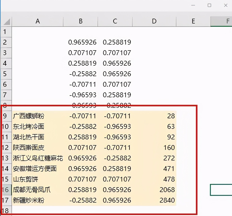 =COS(PI()*(ROW(1:1)*2-1)/12)