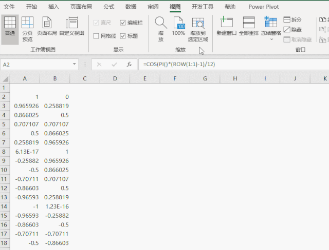 =COS(PI()*(ROW(1:1)-1)/12)