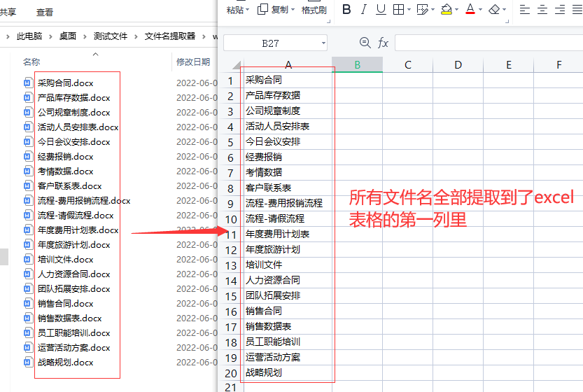 我们打开刚刚导出的excel表格,通过对比我们不难发现,所有文件名全部提取到了excel表格的第一列里面。